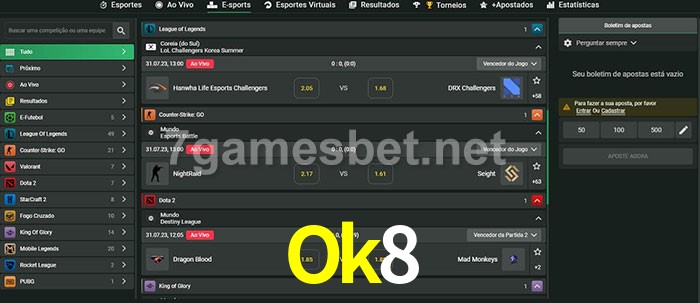 O Ok8 oferece uma grande seleção de opções de apostas em e-sports com probabilidades competitivas